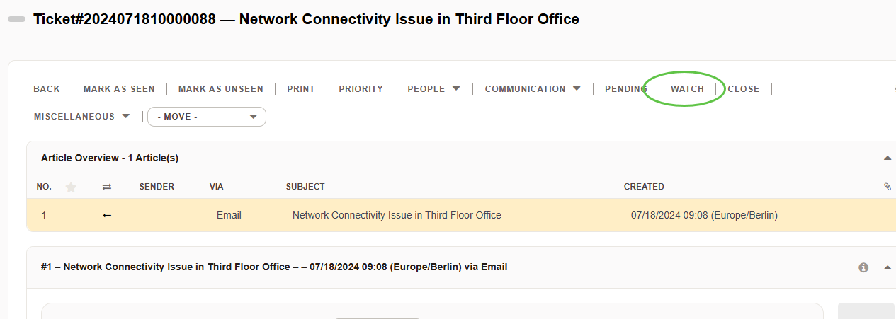 Navigate to the Watched Ticket View: Log into your Znuny dashboard and go to the ticket watcher overview section where your tickets are listed.