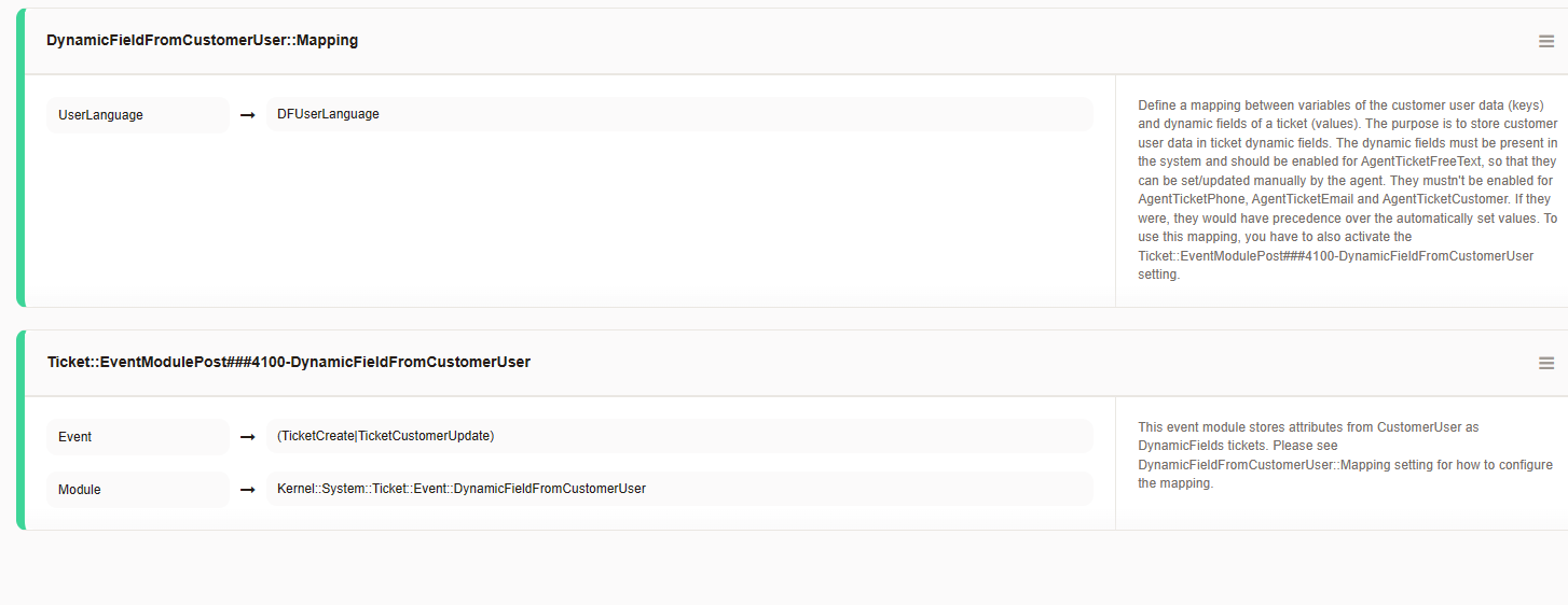 By activating the EventModulePost, the configured attributes from the left side (key) will be copied to the dynamic fields on the right side. This happens when a ticket is created or a customer user is set.