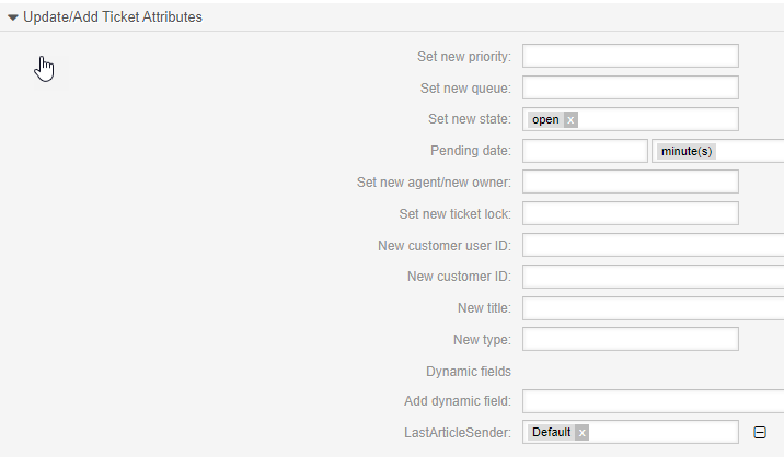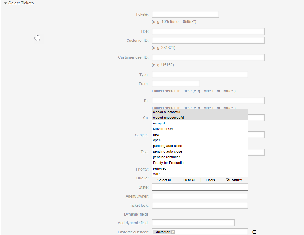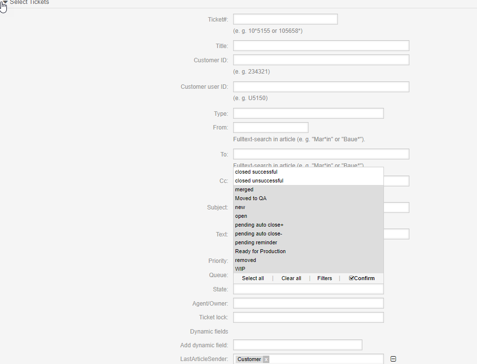 Next, you require a generic agent to match all states except the closed states and the Dynamic Field Name = "Customer". Here, just set Dynamic Field Name = Default". These states will be kept.